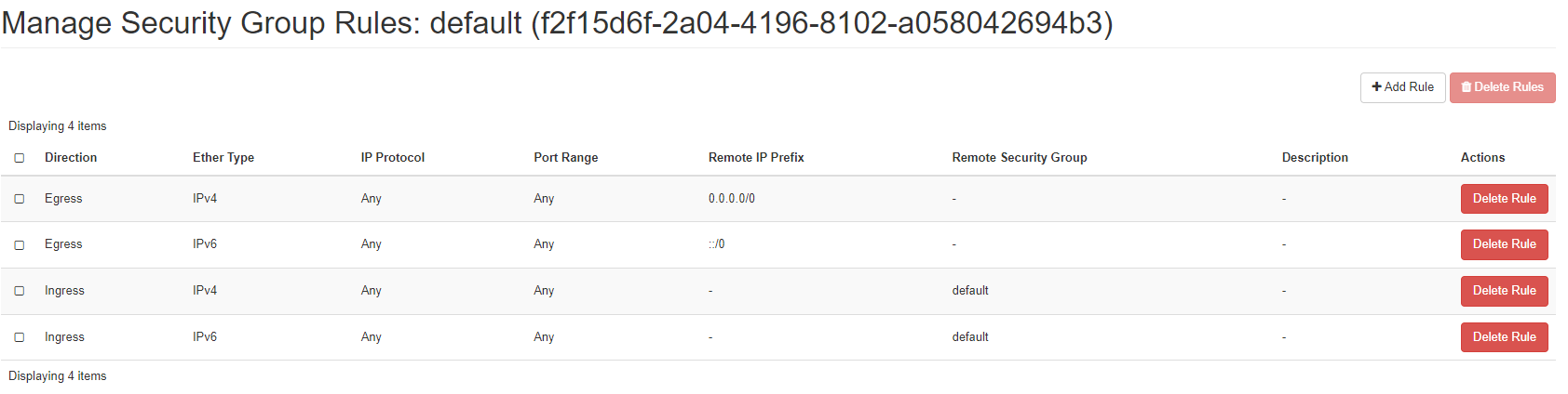 We recommend that no new rules are added to the deafult security group to keep things clean and tidy. We also recommend that no rules be removed from this group.