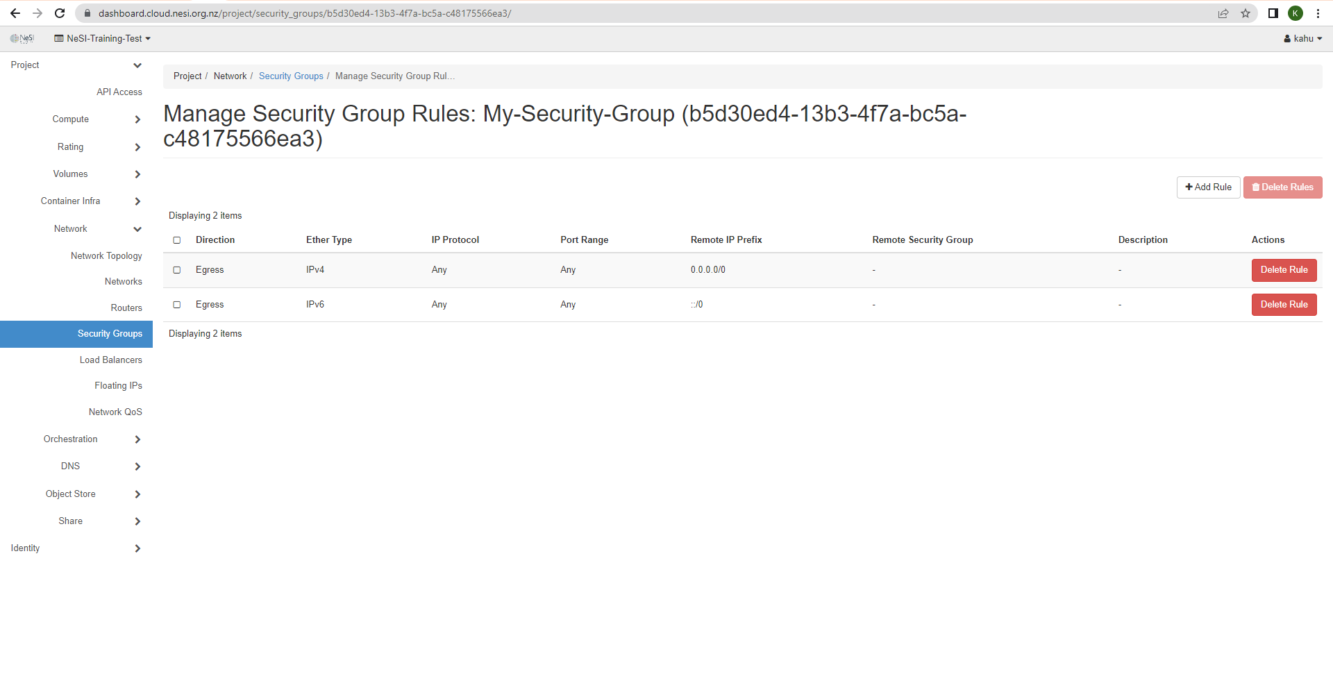 The 2 Egress rules allow the resources within the FlexiHPC project to communicate with the outside world.