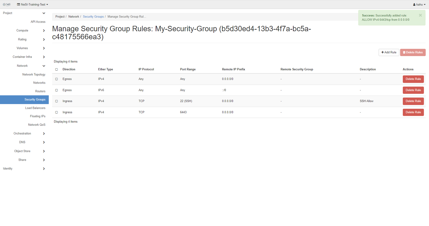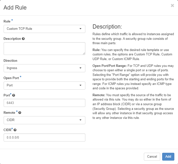 So the things we need to ensure are Rule has been set to Custom TCP Rule, The Direction is Ingress as we are allowing the port into the FlexiHPC space and the Port we would like to allow, in this case 6443.