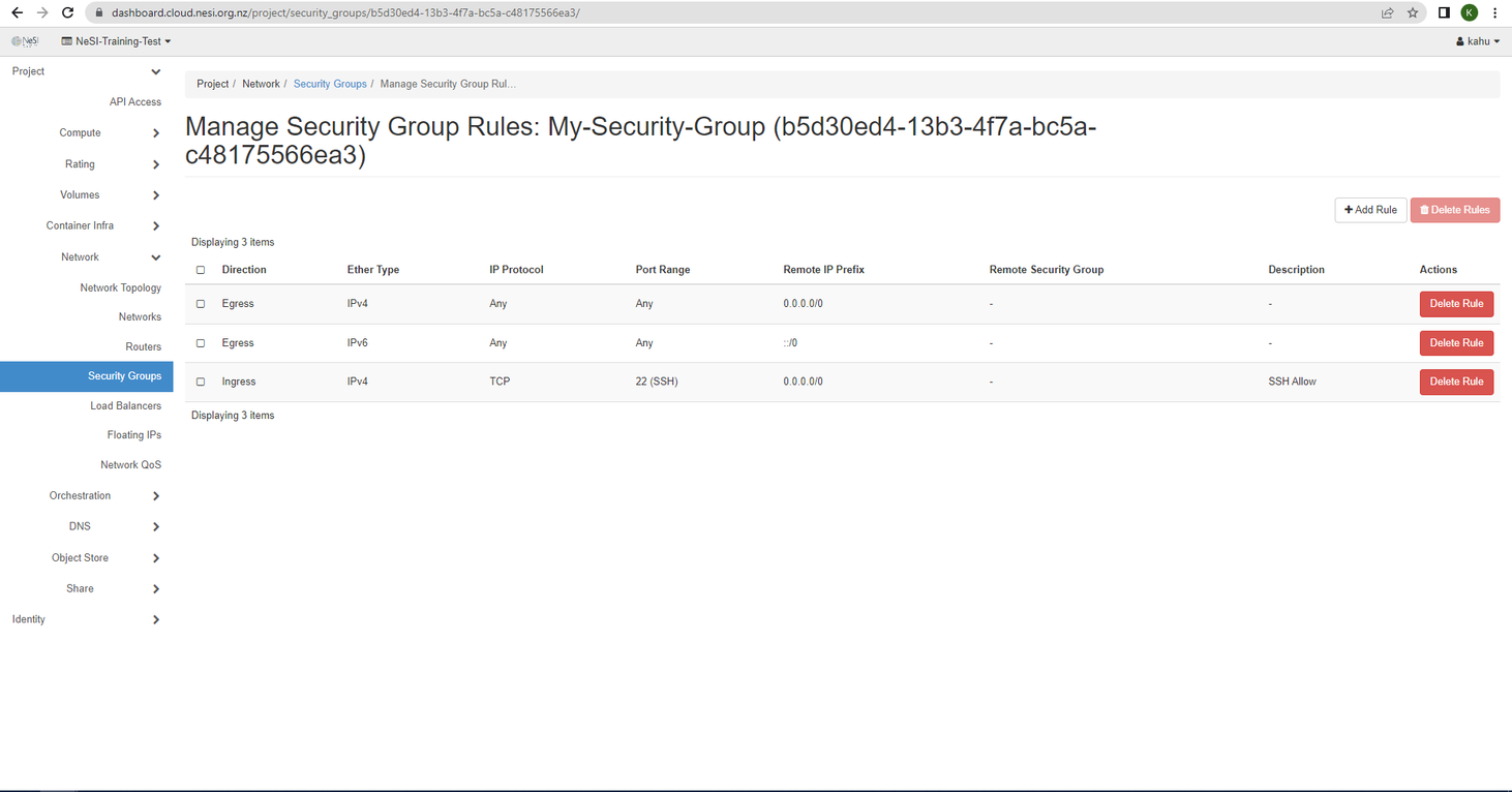The 2 Ingress rules allow any other resource within the FlexiHPC project that has this security group associated to it is allowed to communicate with each other.