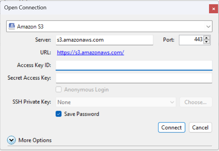 Within the Open Connection dialog you will want to ensure that the dropdown has selected Amazon S3