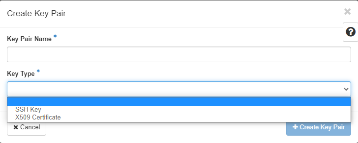 In the Create Key Pair dialog box, enter a name for your key pair, and select a Key Type