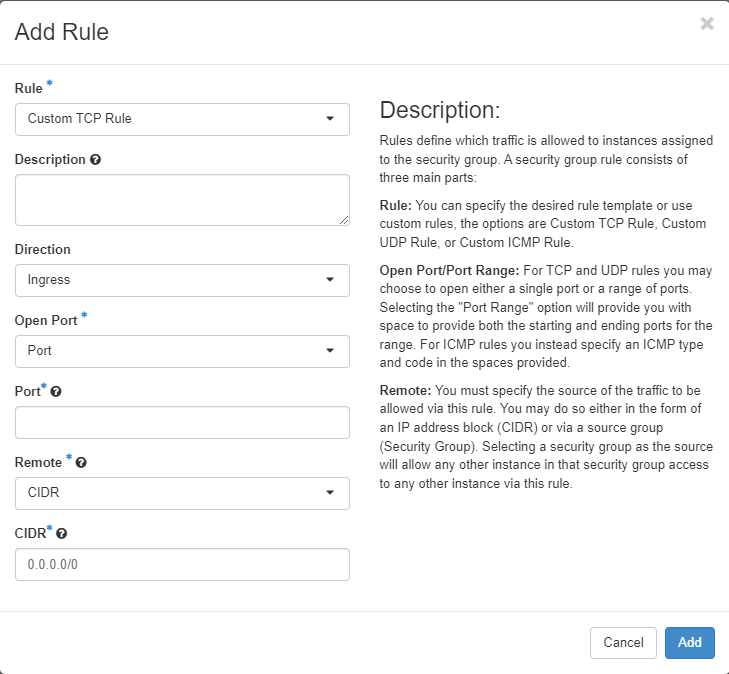 We have a few ways of adding new rules to the security groups, either with predefined rules or customs rules.