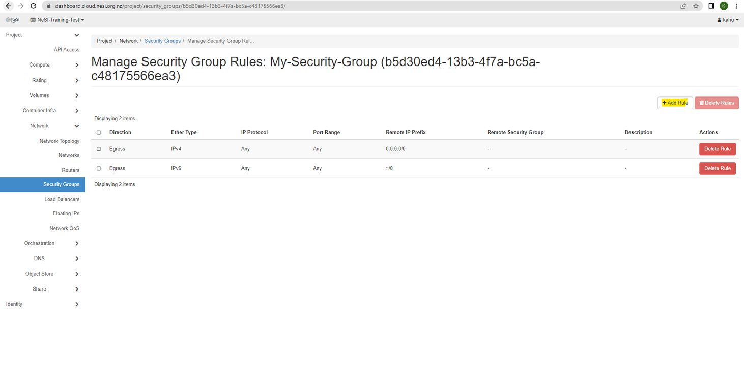 The 2 Ingress rules allow any other resource within the FlexiHPC project that has this security group associated to it is allowed to communicate with each other.