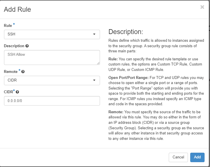 We have specified the SSH Rule, given it a description so it explains what it is for other users, we have chosen CIDR as the remote and left the CIDR as Allow All.