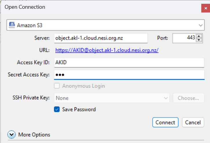 object.akl-1.cloud.nesi.org.nzand the port should be 443 Access Key ID- This should be the EC2 Credentials Access key token